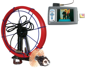 system - Advanced Set (VIS 2000 PRO進階套裝) The video inspection system can be used for optical control and examination of vertically running exhaust systems (modern chimneys) from a min. diameter of 7 cm. With this set the camera head is let down in the chimney by the cable. NEW!!! NOW WITH INTEGRATED METER COUNTER (SHOWN IN DISPLAY OF THE MONITOR)!!! Applications: -inspection and direct